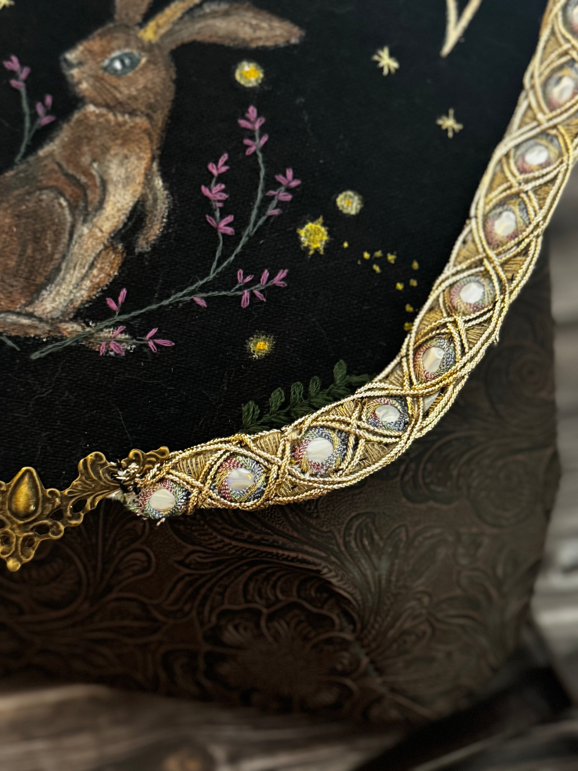 The flap is hand painted and embroidered. (The painting has been made with a special treatment and barnished so it stays in the fabric)